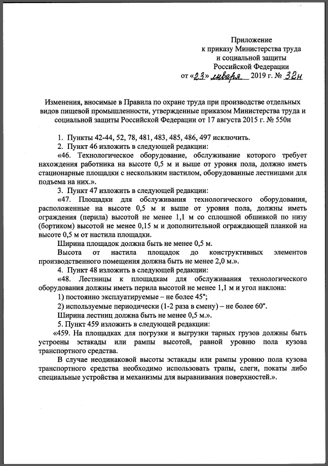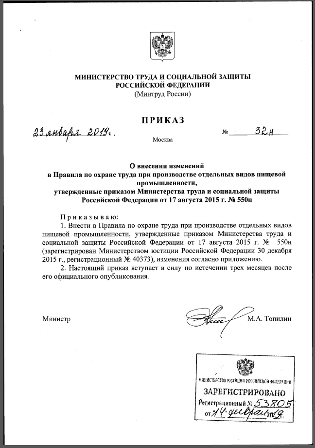 16 мая 2019 года вступили в силу изменения в Правила по охране труда при производстве отдельных видов пищевой продукции, утвержденные приказом Минтруда России от 17.08.2015 N 550н. Изменения внесены приказом Минтруда от 23.01.2019 N 32н.