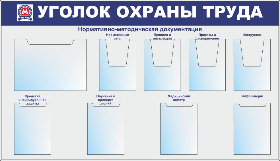 Стенд Уголок охраны труда в индивид. упаковке, карманы плоские А4 -6шт, перек. система А4 на 6 рамок (1400х1200; Пластик ПВХ 4 мм; Профиль ластиковый синий)