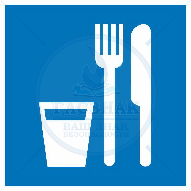 «Пункт (место) приема пищи» — универсальный знак, который используется в быту и на различных предприятиях, где не предусмотрена возможность принимать пищу прямо на рабочем месте. Носит информационный характер: указывает на места в здании, где разрешено есть. Размещается на дверях буфетов, столовых, других подобных помещений. Относится к числу указательных знаков, имеющих следующее цветовое исполнение: белая пиктограмма на синем прямоугольном фоне. В соответствии с ГОСТ имеет кодировку D01.Продукция произведена на территории Российской Федерации и соответствует критериям подтверждения российского происхождения согласно Постановлению Правительства РФ № 719. Номера реестровых записей: 10651105, 10626803. Код ОКПД 2: 32.99.53.190 и 22.29.29.190.